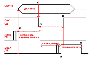 - "Слушатели" при готовности к приему поднимают уровень сигнала ГП (NRFD)